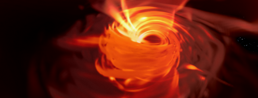 ‘In the simulation you move around the black hole at the centre of our galaxy. The light you see comes from matter that disappears into the black hole in a vortex-like way; due to the extreme conditions it becomes a plasma that starts to glow. This light is then deflected and deformed by the powerful gravity of the black hole. Some of the plasma is ejected away from the black hole in a jet stream at very high velocity. You can see the path that a particle could take in such a plasma flow; it moves continually inwards in a spiral trajectory until it is ejected in the jet stream.’