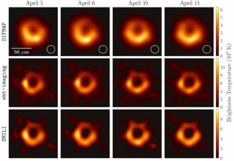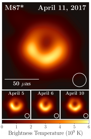 Ad ogni modo, applicando alle immagini un modello semplice della struttura ad anello si ottiene un valore della dimensione dell’ombra intorno a 40 microsecondi d’arco, consistente con quella prodotta da un buco nero di Kerr (cioè in rotazione) di quasi 6,5 miliardi di masse solari.