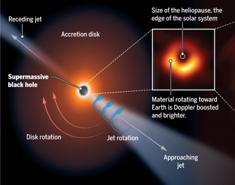 La struttura ad anello è dovuta alla presenza di plasma che si accresce lentamente attorno al buco nero supermassivo in M87 che, a sua volta, alimenta un getto relativistico estremamente brillante e collimato. In prossimità dell’orizzonte degli eventi, la materia emette radiazione luminosa che viene distorta dal campo gravitazionale del buco nero.