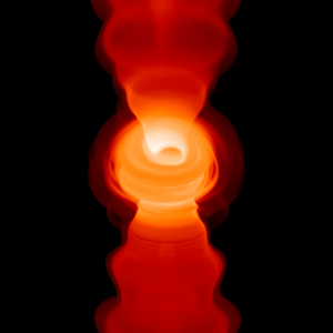 L’immagine illustra una simulazione numerica relativa a un getto relativistico che ha origine nel buco nero e che emette onde radio (banda di frequenza 50 GHz o lunghezza d’onda di 7mm). Si nota il disco di materia che accresce al centro del buco nero e i due getti simmetrici in direzione perpendicolare al disco. Crediti: T. Bronzwaar, M. Moscibrodzka, & H. Falcke
