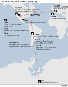 Gli otto osservatori che formeranno l’Event Horizon Telescope. Crediti: BBC