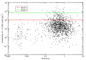 Fig 2. This figure from Section 5. of Fish et al. 2013 shows the luminosity of the known radio pulsar population at 1.4 GHz as a function of spin period. The effective survey sensitivity of searches with ALMA Bands 1 and 3 are indicated with red and green lines, respectively. These limits were scaled using a distance of 8.5 kpc to the GC and assuming an average spectral index of pulsars of −1.6. As can be seen, a significant fraction of the pulsar population lie above the sensitivity limits, even at the distance of the GC, and thus would be detected with phased ALMA.