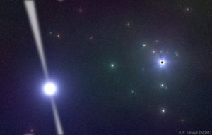 Fig 1. A radio-loud magnetar has been discovered as close as one third of a light year from Sgr A*, with an orbit of somewhere between about 500 years and 1500 years. Thats pretty close in astronomical terms, but for testing the space-time around the black hole, a pulsar in an orbit of less than one year would be ideal. While evidence suggests that many pulsars should reside in the Galactic Centre, only 6 have been found within about 230 light years. The question is: Can we discover any more? Image information: Artists impression of PSR J1745-2900 in the direct vicinity of Sgr A*. © MPIfR/Ralph Eatough 2013.
