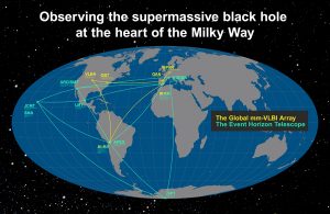 This infographic details the locations of the participating telescopes of the Global mm-VLBI Array (GMVA), and the Event Horizon Telescope (EHT). Their goal is to image, for the very first time, the shadow of the event horizon of the supermassive black hole at the centre of the Milky Way, as well as to study the properties of the accretion and outflow around the Galactic Centre. Credit: ESO/O. Furtak