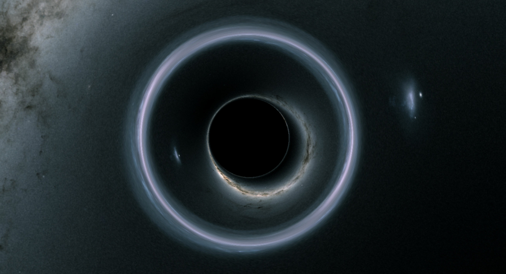 Observer view from just outside the event horizon, looking outwards from the black hole. This image was taken very close to r=2, which is the black hole’s event horizon. At this extreme location, virtually all look directions correspond to light orbits that plunge into the black hole, so the event horizon takes up almost all of our celestial sphere, and the outside universe appears to us as a shrinking circle of light directly ‘above’ us.